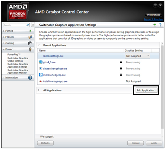 3- No Menu Lateral, em energia clique em Configurações do aplicativo de gráficos alternáveis, e clieque em adicionar aplicativo