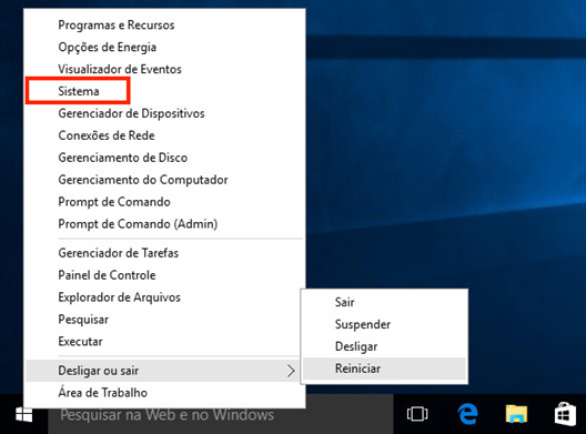 1 - Na área de trabalho do windows, clique no botão “Iniciar” (Bandeira do windows) com o botão direito do mouse (Secundário) e em seguida na lista de opções aberta, clique em “Sistema”.