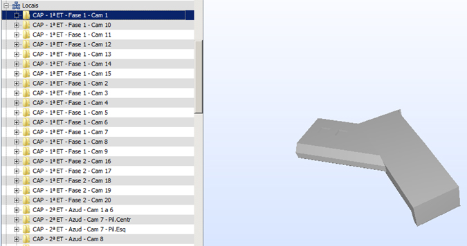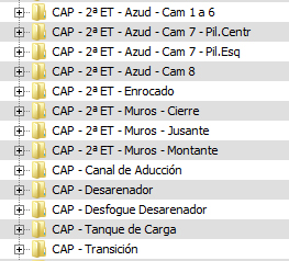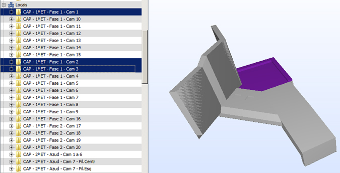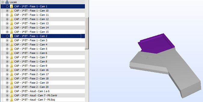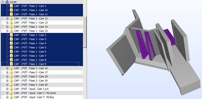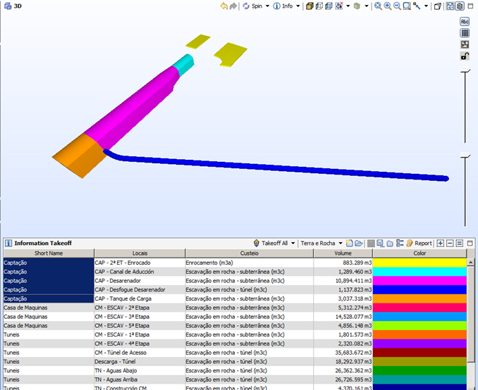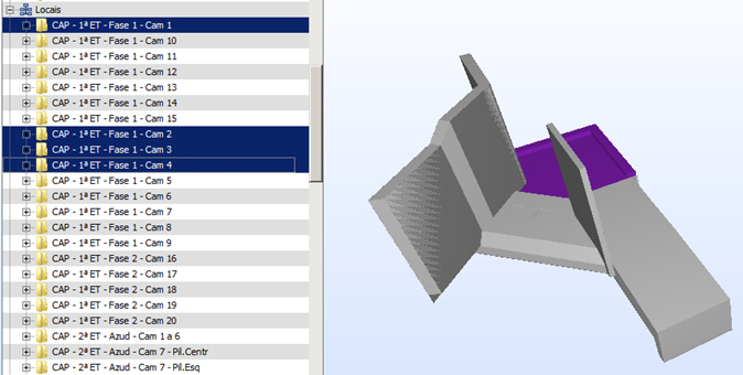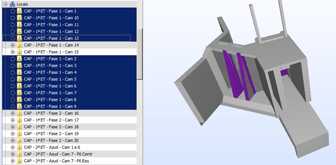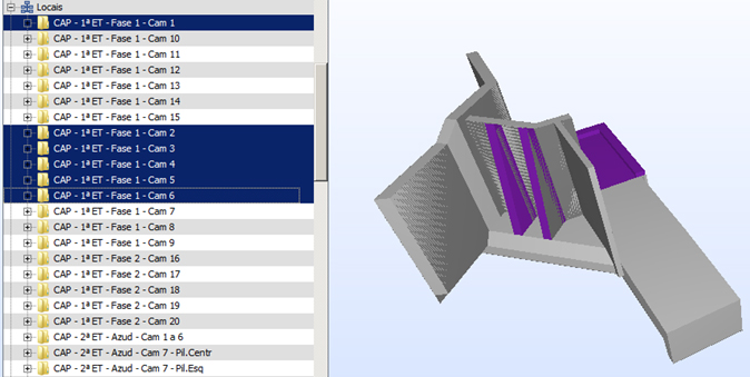 A classificação por Local foi utilizada para agrupamento dos objetos pertencentes a um mesmo item do cronograma, ficando com o seguinte resultado, onde são exibidos no 3D os itens de Terra e Rocha da Captação: