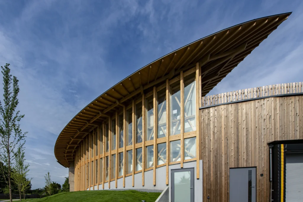 Este edifício é construído com madeira semirresistente ao fogo, principalmente cedro e cipreste. As claraboias da parede de taipa, juntamente com as altas janelas laterais que favorecem a ventilação natural, e até mesmo a suave cascata de água da chuva do telhado, funcionam como condutos, justapondo céu e terra. Dessa forma, desempenham também um papel fundamental na redução das emissões de CO₂ do edifício.