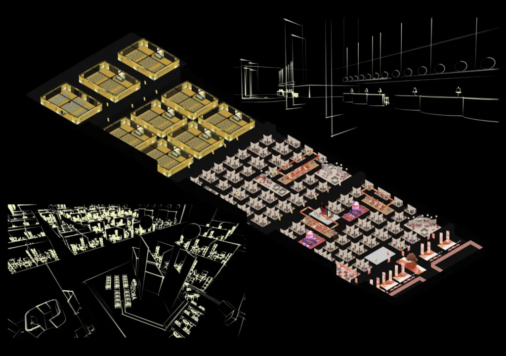 Jean-Paul também produziu renderizações e perspectivas 3D imersivas que ajudaram os clientes a se imaginarem imediatamente dentro do conceito e a compreenderem sua atmosfera. Para os prestadores de serviços, o mesmo modelo ajudou a gerar documentação precisa sobre iluminação, distribuição de energia e requisitos de áudio e vídeo, até mesmo com posições calibradas em milímetros para luminárias e peças personalizadas, mantendo intacta a linha narrativa do projeto.