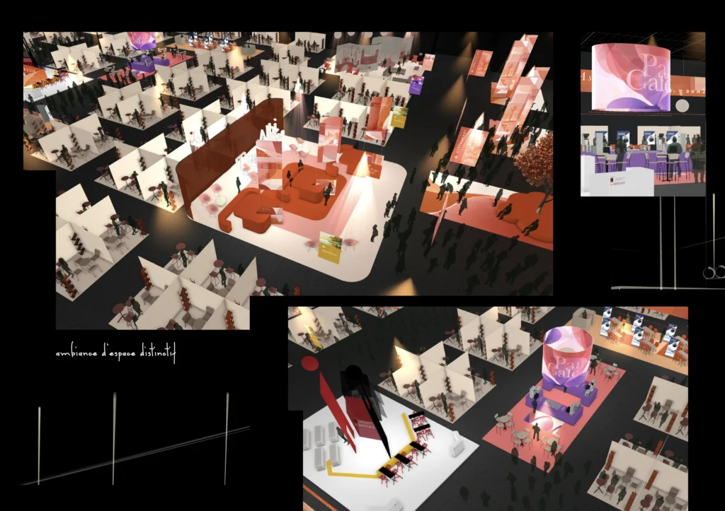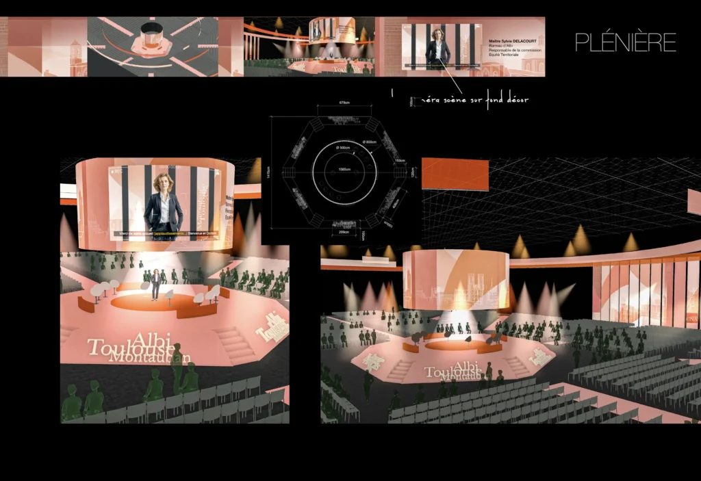Essa filosofia norteou o trabalho do Jean-Paul Haure Studio na próxima feira CNA 2026, o Congresso Nacional dos Advogados Franceses, que receberá mais de 6.000 participantes ao longo de três dias. “A agência que solicitou nossa perspectiva queria destacar a identidade regional e o estilo de vida”, observou Jean-Paul, descrevendo um briefing que lhe pedia para traduzir o charme do sul da França, como seu sol, arquitetura, paisagem e cores.