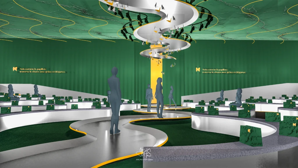 Alcançar esse objetivo exigiu poesia e rigor. O projeto precisava integrar diversas zonas distintas, cada uma com capacidade para até 4.000 pessoas. Assim, Jean-Paul considerou a circulação, as linhas de visão e os momentos de descanso como parte da narrativa, coreografando a forma como os visitantes se deslocariam entre as sessões, encontrariam árvores e elementos naturais, e ainda se sentiriam parte integrante de um único evento, e não apenas dispersos por um labirinto de corredores.