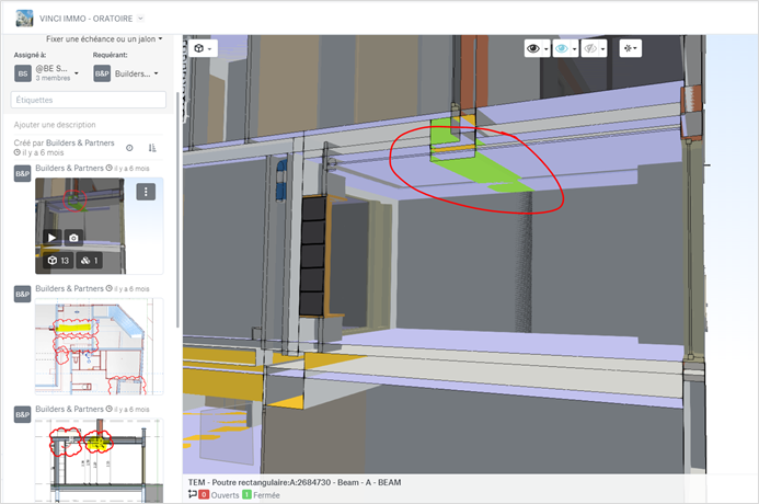 No projeto HORA, os responsáveis pelo design dos modelos 3D faziam o upload dos modelos com uma frequência de aproximadamente duas semanas a partir da emissão da licença de construção. O Gerente BIM monitorava a produção regularmente, inclusive avaliando inconsistências entre as disciplinas. Os Fatores de Conformidade BIM (FCB) resultantes dessas análises eram revisados durante as reuniões de projeto com toda a equipe, incluindo o cliente. Quanto mais densa se tornava a fase de estudos técnicos, mais o arquiteto e os escritórios de projeto de Fluidos e Estruturas verificavam a coerência entre seus modelos durante o upload. Isso gerou mais problemas. O cliente também fez comentários por meio desse mecanismo, assim como o controlador técnico e o economista. Nas reuniões, a decisão de alterar o status de um item era tomada em conjunto e arbitrada pelo Gerente BIM para itens de banco de dados ou pelo gerente técnico da VINCI Immobilier para itens técnicos de construção.