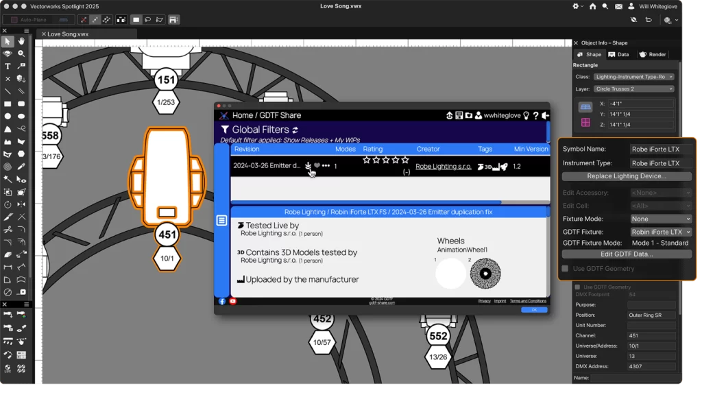 Mantenha seus arquivos atualizados com o Mapeamento GDTF, que fornece a você informações precisas sobre equipamentos e acessórios para evitar erros. Mapeie arquivos GDTF para acessórios com acesso direto ao GDTF-Share para baixar e importar os arquivos com uma única ação dentro do Vectorworks. Atualize automaticamente todos os perfis GDTF com um único comando e armazene GDTFs atribuídos em seus dispositivos de iluminação.