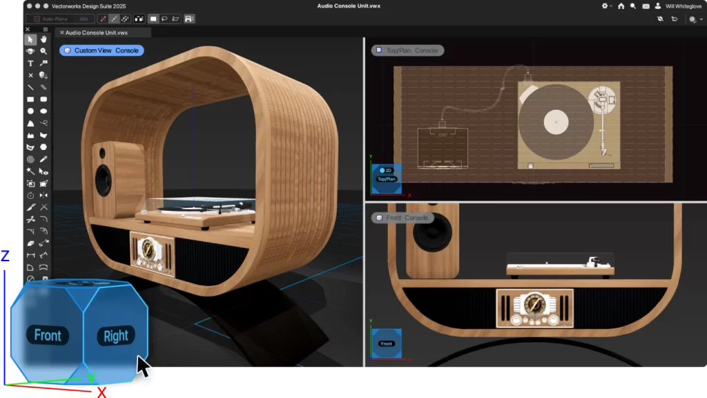 Descubra a navegação com um clique que permite uma navegação fácil e o acesso instantâneo a todas as vistas de seu modelo orbitando intuitivamente clicando-arrastando. A exibição opcional dos eixos XYZ, direção da bússola e os planos de trabalho ajudam você a se orientar e navegar facilmente por seu modelo. Você poderá desligar facilmente (mas você não vai querer fazer isto) com um menu popover.