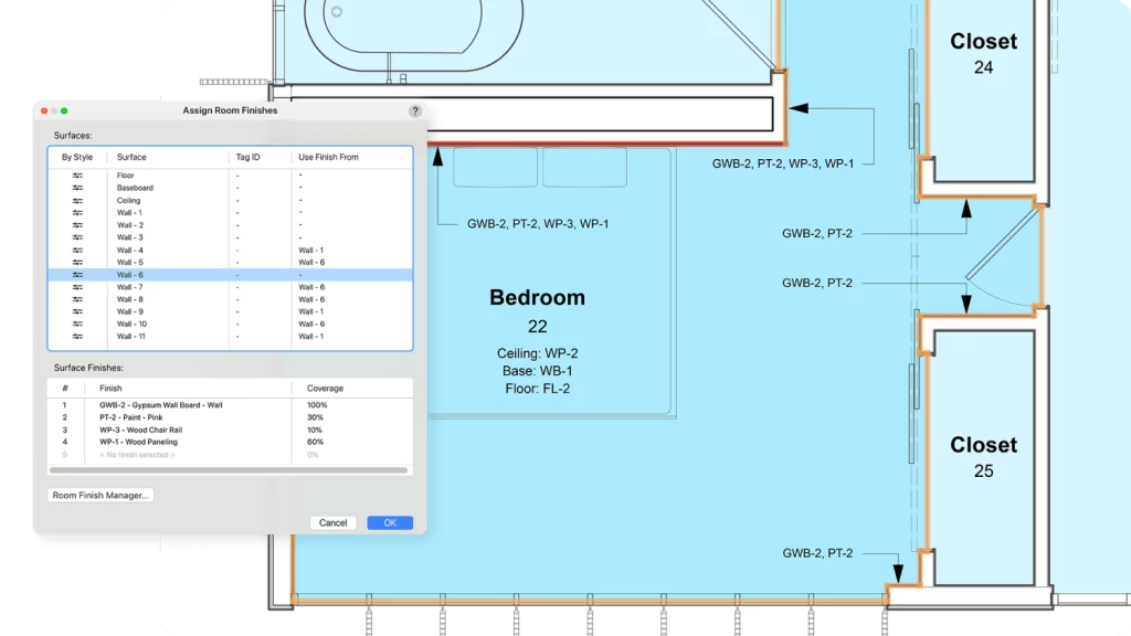 Adote uma abordagem versátil para seus projetos com a capacidade para selecionar múltiplas paredes e aplicar acabamentos de superfície em uma única operação. Em seguida, gerencie, anote e crie relatórios com acabamentos de projeto personalizáveis e visualização de dados para ajudar a otimizar os relatórios, liberando tempo para você se concentrar na personalização do seu ambiente.