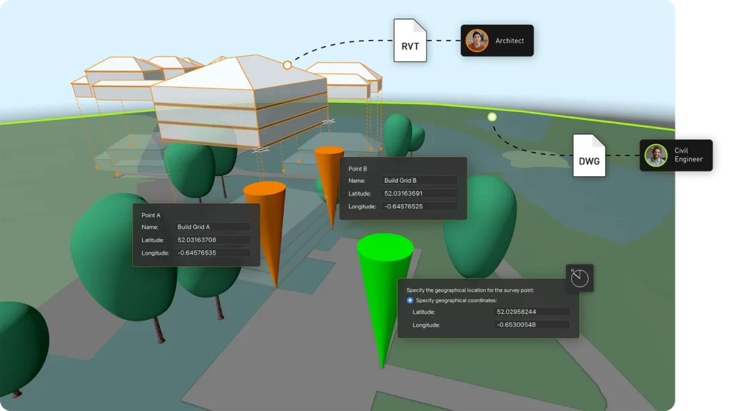 Estabeleça de forma rápida e fácil um levantamento geográfico ou ponto de referência com uma única operação, economizando tempo e evitando complicações entre colaboradores. Perfeito tanto para projetos novos como existentes, coloque um ponto de levantamento em qualquer lugar no documento para especificar coordenadas, ângulos para norte verdadeiro e informações de elevação em 2D e 3D.