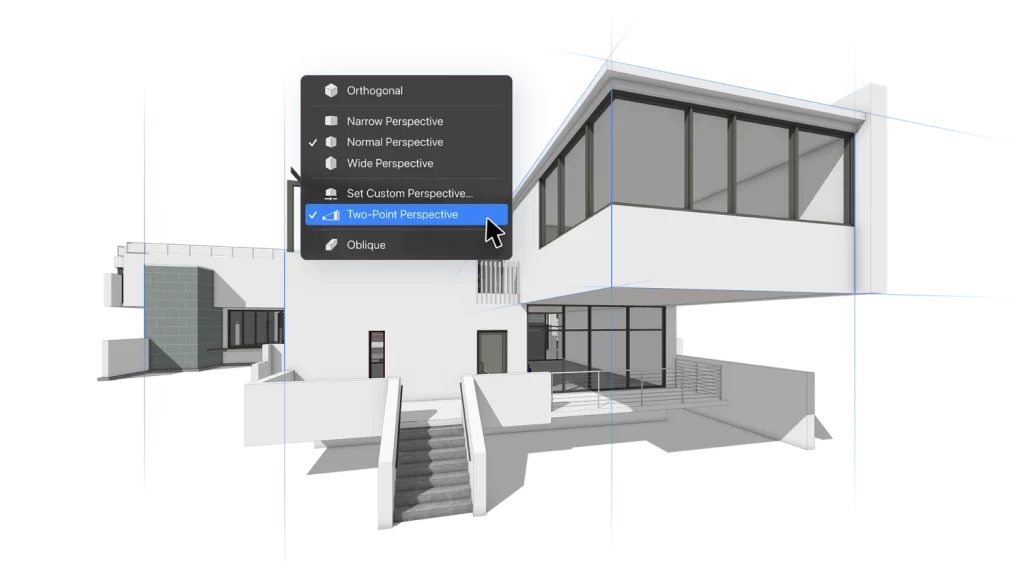 Gere visualizações com perspectivas arquitetônicas tradicionais com facilidade usando o modo de Perspectiva com Dois Pontos. Ativado com um único clique, você pode trabalhar com este modo de perspectiva diretamente nas camadas de projeto ou adicioná-lo às vistas salvas e viewports para visualizar com este novo modo de perspectiva. Uma vez ativado, ele permanecerá ativa mesmo quando você alterar sua vista.